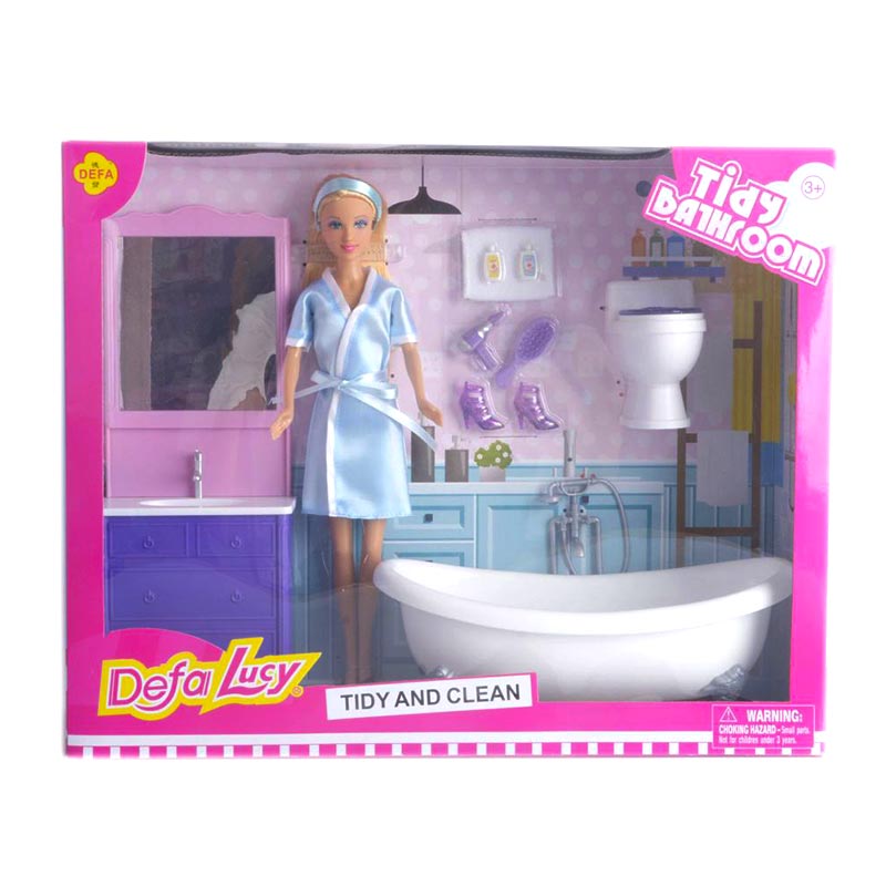 عروسک باربی دفا با وسایل حمام شامل یک عدد عروسک دخترانه دفا همراه با وسایل حمام باربی اسباب بازی مانند وان، روشویی، توالت فرنگی، شانه، سشوار، کفش، حوله و شامپو میباشد. باربی دفا جزو محبوب ترین انواع اسباب بازی دخترانه و پسرانه است.