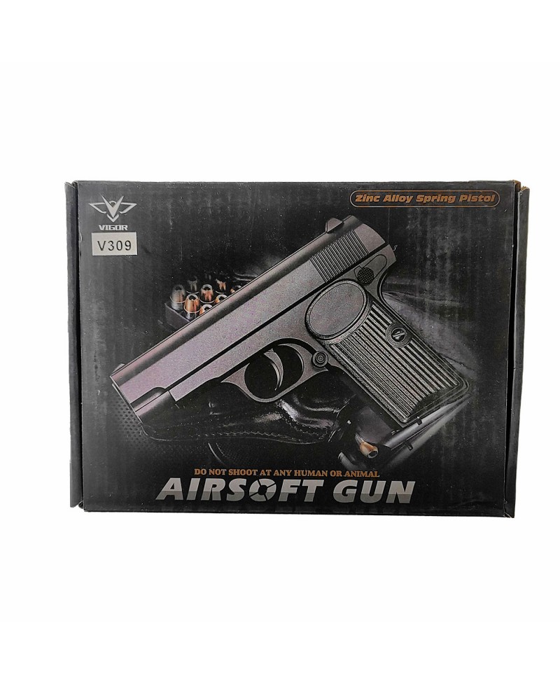 این کلت فلزی ساچمه ای بوده که ساچمه 6 میلی متر خورده که در بسته آن یک بسته ساچمه موجود است و خشاب آن نیز کامل پر میشود و با هربار گلنگدن کشیدن تفنگ مسلح شده و شلیک میکند . برد کلت فلزی ساچمه ای V309 حدود 10 متر بوده که این محصول از برند ویگور Vigor و سری ایرسافت Airsoft میباشد .