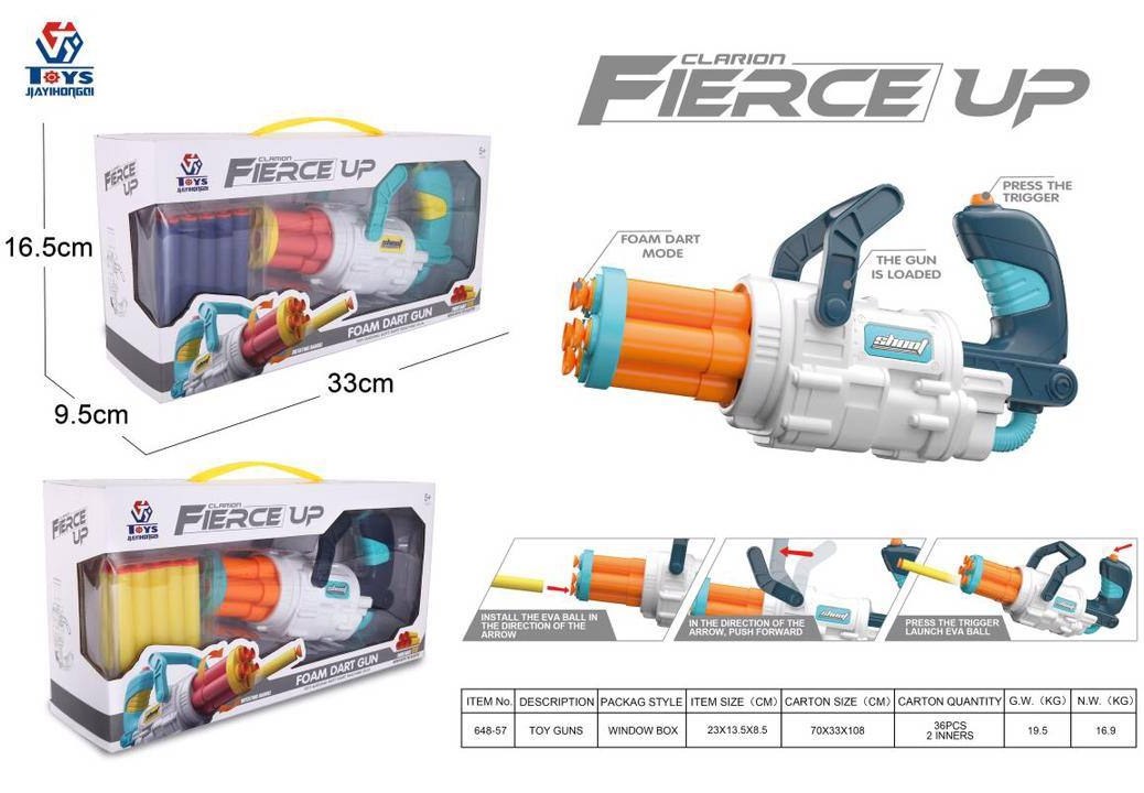 تفنگ های رگباری یکی از جذاب ترین تفنگ های اسباب بازی هستند و پسر بچه ها دوست دارند تفنگی داشته باشند که علاوه بر قابلیت تیر پرتابی، بتواند بصورت رگباری و پشت سر هم نیز تیر پرتاب کند. تفنگ تیر اسفنجی مدل ۶۴۸/۵۷؛ قابلیت حمل و شلیک ۵ گلوله در هر بار مسلح شدن را دارد. این مسلسل اسباب بازی، با یک مکانیسم دستی مسلح می شود، و نیازی به باتری ندارد.